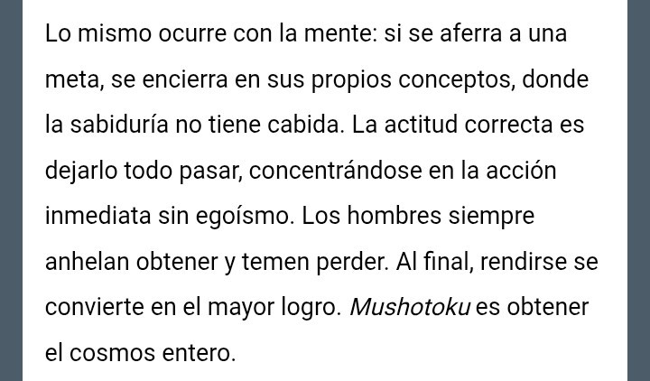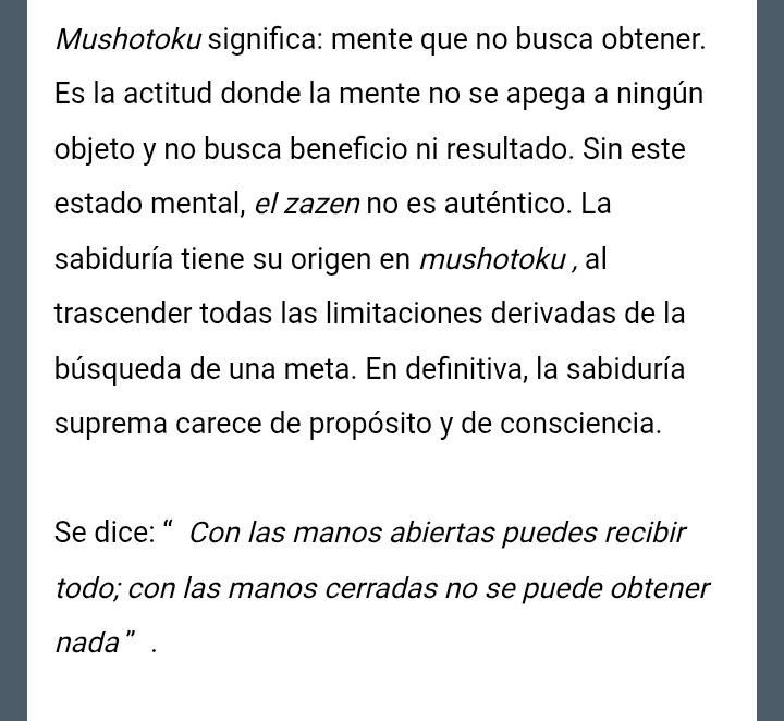 MUSHOTOHU es la filosofía del no provecho, no deseo de adquirir. Es el principio esencial. Dar sin esperar recibir nada a cambio. Abandonarlo todo sin miedo a perder. Volver la mirada hacia el interior. De la misma manera que en toda obra de arte el artista debe darse completamente sin preocuparse de alcanzar la gloria, la belleza o la riqueza para expresarse en una obra bella, pura, auténtica, de la misma manera el discípulo obtendrá la sabiduría si quiere conocerse, superarse, darse sin esperar alcanzar ningún provecho personal. Si lo abandonais todo, lo obtendreis todo.